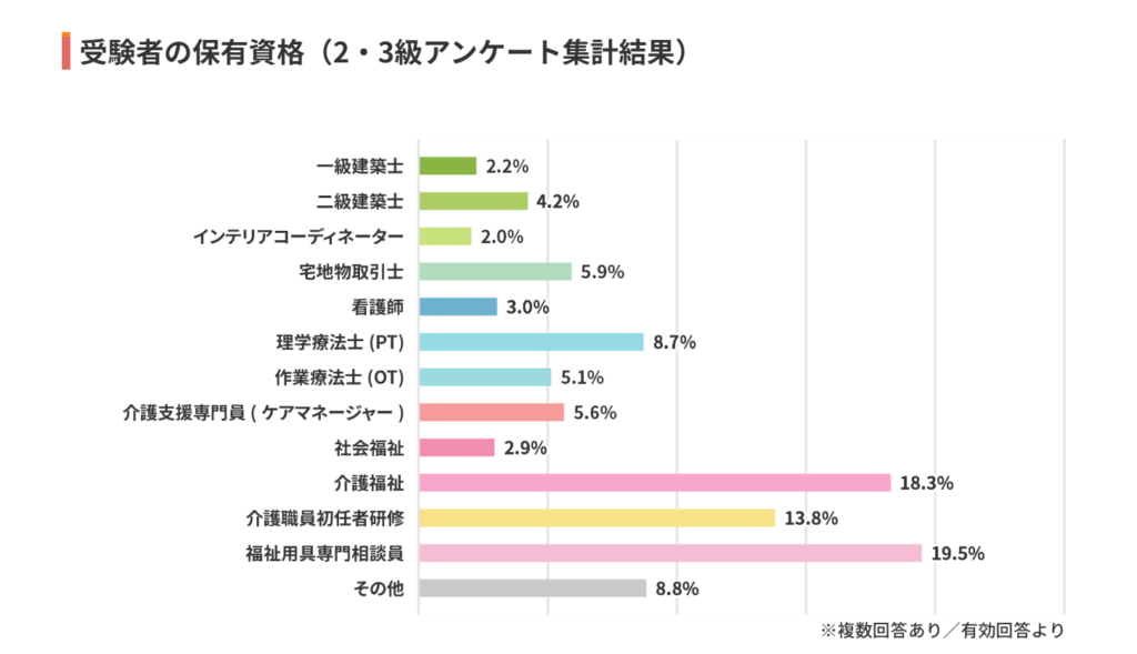 今は介護や福祉関係者の資格取得が多いようですが、住宅業界でも必要になってくる人材でしょう。福祉住環境コーディネーターの有無がリフォーム会社選びの基準のひとつになることも考えられ、ケアマネジャーや利用者の信頼にも繋がります(介護・福祉業界内では認知度が高い資格なので、一定の信頼を得ることができます)。