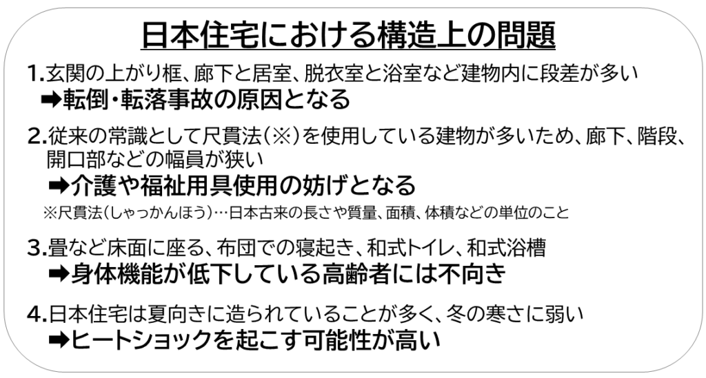 「自宅を終の棲家に」と考える方が多い中で、次のような昔ながらの日本住宅における構造上の問題があげられます。